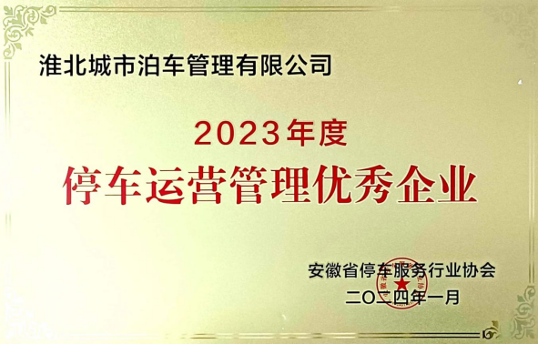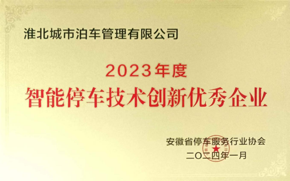 2024年1月,淮北城市泊車管理有限公司被安徽省停車服務(wù)行業(yè)協(xié)會授予2023年度“智能停車技術(shù)創(chuàng)新優(yōu)秀企業(yè)”、“停車運營管理優(yōu)秀企業(yè)”的殊榮。