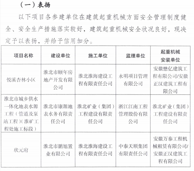 2025年7月21日,淮北市建筑工程管理處發(fā)布了2025年建筑起重機械安全專項檢查情況通報,淮海建工公司承建的悅溪杏林小區(qū)、狀元府兩個項目在安全管理制度健全、安全生產措施落實及建筑起重機械安全狀況良好等方面表現(xiàn)突出,獲得市建管處通報表揚的同時也為公司贏得了信用加分!