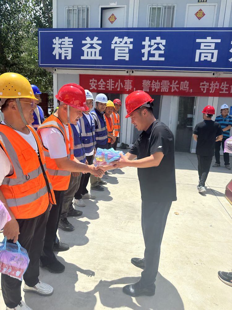 在項目現(xiàn)場,趙焱將防暑降溫物資送到一線施工人員手中,對他們在高溫環(huán)境下堅守崗位、辛勤付出表示感謝,同時叮囑大家要注意防暑降溫,確保自身安全與健康。